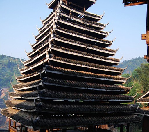 苗族鼓樓在臺江縣城東南方20公里的排羊鄉九擺村上寨中間,樓旁古木參天,蒼翠綠郁。 鼓樓為三重檐歇山頂屋面,木結構建筑,覆蓋小青瓦,其 下層呈平面四方形,空間寬敞。樓高11米,占地52平方米,整 個建筑結構以中間獨柱為中心,周圍16根外環檐柱為襯。利用 逐層內收的粱、枋、瓜柱、檐柱支撐挑出屋檐。結構無一釘一 鉚,攆橫穿斜插,銜接緊密牢固。前后留進出通道。左右柱外 、設置美人靠坐欄,供人坐息。其用料粗大,結構嚴謹、工藝精湛,經風雨數百年,巍然不動。版權所有山東聊城聊之旅國際旅行社有限公司,轉載必究!樓中地面設有一直徑約23厘米 的地鼓,在舉行祭祀儀式時才用,是時擊鼓而眾人圍舞,故稱鼓樓。為至今發現唯一存留的苗族鼓樓。