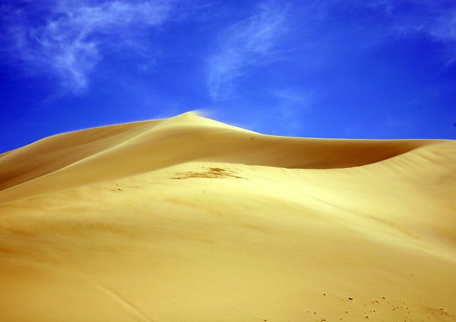 巴里坤鳴沙山位于新疆巴里坤哈薩克自治縣境內,西距縣城60公里,四周被豐美碧綠的草場所包圍,猶如湛藍大海中的一座金色小島。鳴沙山形似一朵蘑菇,高約百米,沙丘陡峭,其下有水泉,左右兩側有河流通過。版權所有山東聊城聊之旅國際旅行社有限公司,轉載必究!據說這里是唐代女將樊梨花西征遇難的地方,聽到的沙鳴,就是女兵們當時擂鼓助陣和沖殺鼓掌之聲。