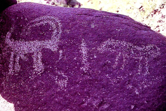 克爾堿巖畫位于托克遜縣庫加依鎮境內,南距鎮政府約4.5千米,巖畫散布在鎮北的克爾堿 溝兩岸,畫面內容主要有:羊、牧羊人、鹿、狗、駱駝以及狩獵、放牧等場面。其中一幅水系圖令人注目。巖畫基巖均為侏羅紀粗砂巖。相傳有位神匠途經此地,眼見四周環境優美,于是整日靜坐在河岸欣賞,后將四周景色逐一刻畫于巖壁上,形成人們今天看到的巖畫。