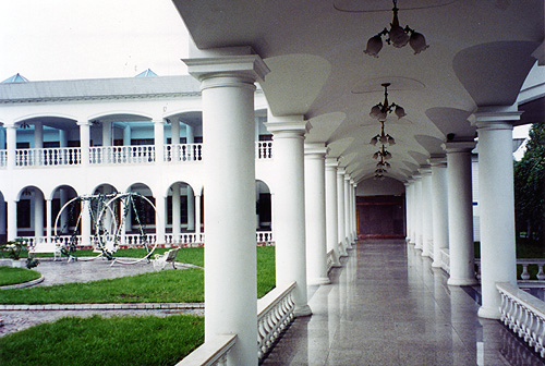 候的影響。庭院內設施齊全、高檔,可獨成一體使用。有豪華套房二十余套,甲、乙套房是小型別墅式建筑,樓上臥室、書房采用櫸木地板,樓下鋪設花崗石地面。衛生間窗明幾凈,有沖浪式浴缸和按摩沐浴房?,F代化的家具造型簡潔,使室內充滿現代化氣息。內庭花園綠草茵茵,一組充滿童趣的雕塑,個個小天使憨態可居,讓您忍俊不禁。轉瞬間,疲憊和煩惱都已消失,回歸自然,返樸歸真的情趣油然而生。