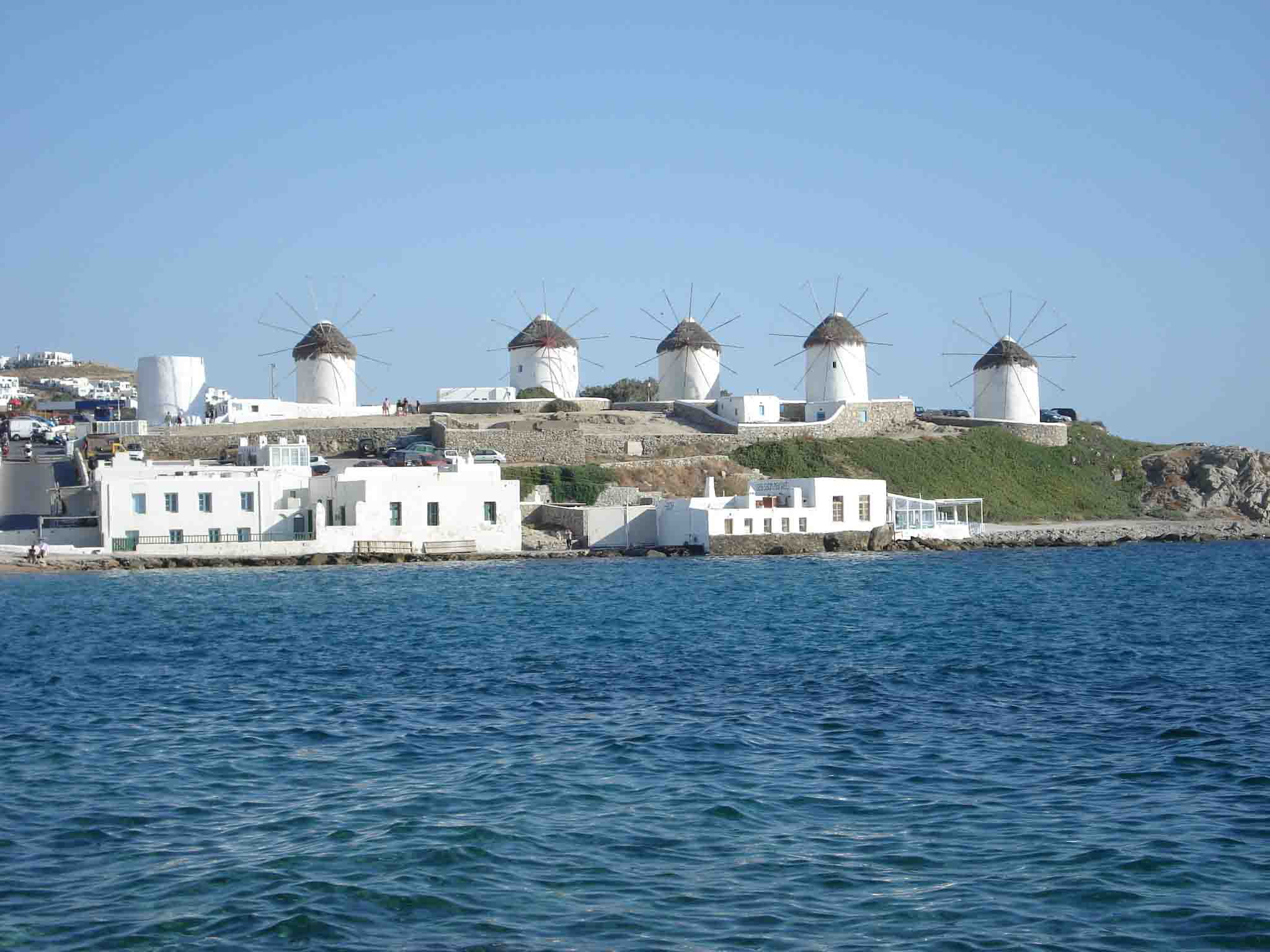 米克諾斯島是希臘南部基克拉澤群島中的一座,也是愛琴海上最享盛名的度假島嶼之一。島上居民很少,每年大約半年的非旅游時間,島上相當安靜。四月以后,旅游季節開始了,來自世界各地的游客就像候鳥一樣絡繹不絕地飛來島上,享受地中海的陽光和海灘。在島上漫步,看到房頂都是用大石塊壘起的平頂,覺得很奇怪。問了當地的居民后才知道,島上冬天寒冷,風特別大,只有這些結實的屋頂才能抵御寒風。在島西南面海邊的小山丘上,有5座基克拉澤式的風車,這是米克諾斯島的標志。