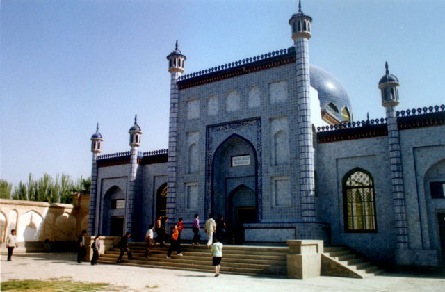 禮拜殿為平頂,主墓室是綠琉璃圓頂;而且其東部建筑中所用塔樓(邦克樓)甚多,約10余座,為新疆同類建筑中少見;塔樓的制作精美可觀,也是建筑裝飾。整個建筑群高低相間,主次分明,形成一完整的群體。墓室外墻以藍底白花琉璃磚貼面,禮拜殿木柱的雕刻花紋古拙奇特,紋樣豐美,與一般制作方法不同,都是新疆伊斯蘭建筑中難得的精品,為后世所罕見,體現出古代維吾爾工匠的高超技藝和杰出才能.