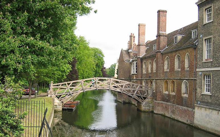 走進皇后學院,可以見到一座古老的木橋橫跨于劍河之上,這就是舉世聞名的數學橋,又叫作牛頓橋。相傳牛頓采用數學和力學的方法設計并建造了這座橋,橋上沒有用一顆釘子。牛頓的學生認為:牛頓老師能做到的事,牛頓的學生也能夠做到。他們把這座橋拆了,可是怎么也不能把這座橋不用釘子恢復成牛頓老師建筑的原樣,最后不得不用釘子才重新將木橋架好。這個故事是假的,因為數學橋是在牛頓死后22年才建起來的。真正的情況是,該橋最早是用鐵釘連接,比較不明顯,但是現在新造的這座用的是螺絲。(不過這座橋似乎確實是被一名好奇的學生拆開來,然后再重新裝回去的)。