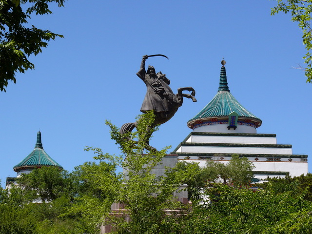 成吉思汗廟坐落在興安盟烏蘭浩特市罕山之巔,始建成于1940年,這座融漢、蒙、藏三個民族建筑風格于一體的廟宇,從正面看是"山"字形。正殿當中有16根粗大的紅漆明柱,四周繪有反映成吉思汗業(yè)績的精美圖案,中央為2.8米高的成吉思汗銅像;兩偏殿陳列有元代的兵器,服裝,瓷器等復制品,山門到正殿有寬10米、長158米用花崗巖砌成的81級臺階。