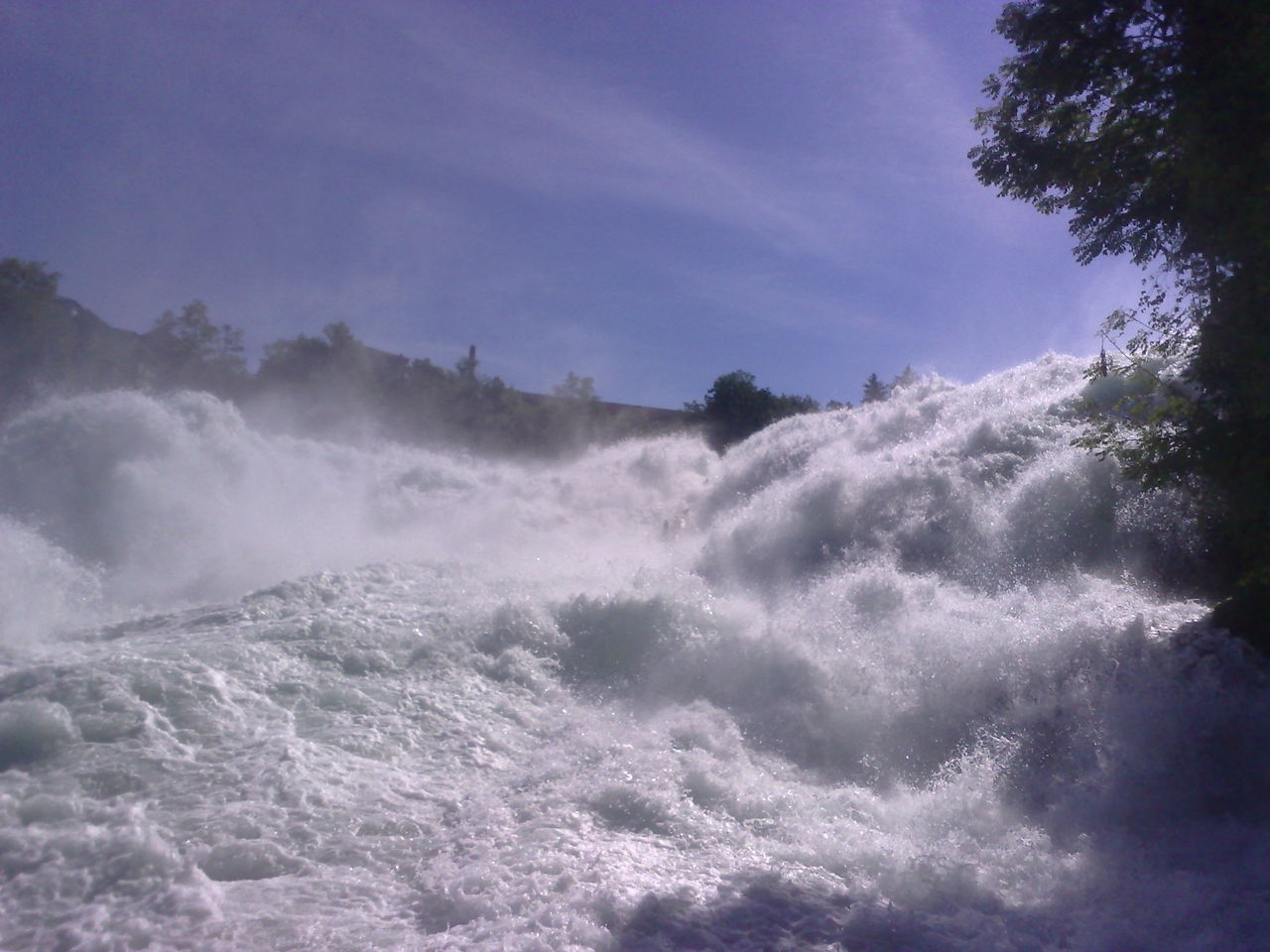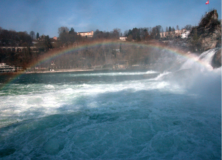 中歐最壯觀的瀑布,在瑞士北部萊茵河上游。包括一些險灘在內,全部落差約30米(100呎),寬150米(492呎)。一塊柱狀巖石把瀑布分成兩個主要部分,位于河右岸的落差約15米(50呎),左岸約20米(65呎)。
