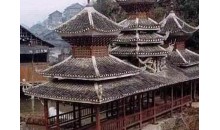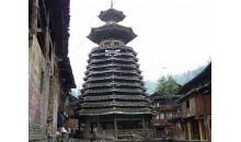 苗族鼓樓在臺江縣城東南方20公里的排羊鄉(xiāng)九擺村上寨中間,樓旁古木參天,蒼翠綠郁。 鼓樓為三重檐歇山頂屋面,木結(jié)構(gòu)建筑,覆蓋小青瓦,其 下層呈平面四方形,空間寬敞。樓高11米,占地52平方米,整 個(gè)建筑結(jié)構(gòu)以中間獨(dú)柱為中心,周圍16根外環(huán)檐柱為襯。利用 逐層內(nèi)收的粱、枋、瓜柱、檐柱支撐挑出屋檐。結(jié)構(gòu)無一釘一 鉚,攆橫穿斜插,銜接緊密牢固。前后留進(jìn)出通道。