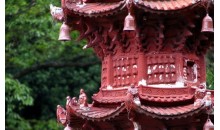 陶塔位于涌泉寺門前兩側(cè)。該對(duì)陶瓷千佛塔,高6.83米,于1972年從福州南郊龍瑞寺移來(lái),用作鎮(zhèn)寺之寶。它是宋元豐五年(1082年)用陶土分層燒造,然后拼合累疊而成的。此類以陶燒造的寶塔,在國(guó)內(nèi)十分罕見。該對(duì)陶塔,東邊的稱“莊嚴(yán)劫千佛寶塔”,西邊的稱“賢劫千佛寶塔”。兩塔形式相同,均為八角九層,每座塔壁均貼有雕塑佛像1078尊,八角塔檐上有四方佛72尊,懸掛陶制塔鈴72枚。石砌塔座刻有金剛力士、蓮瓣、舞獅等,刻銘文記述建造時(shí)間和捐獻(xiàn)者以及造塔工匠的姓名。