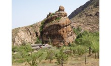 遼代石窟“真寂之寺”即林東后召廟石窟寺。其寺位于遼上京南15公里的山谷中。石窟開鑿在桃石山東南面陡壁上,分中、南、北三窟??咔笆乔宕m建的喇嘛廟“善福寺”。中窟眉額刻“真寂之寺”四個大字,當為遼代開鑿石窟的題名。“