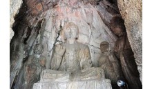 潛溪寺高、寬各九米多,進深近七米,大約建于一千三百多年前的唐代初期。窟頂藻井為一朵淺刻大蓮花。主佛阿彌陀佛端坐在須彌臺上,面頤豐滿,胸部隆起,衣紋斜垂座前,身體各部比例勻稱,神情睿智,整個姿態給人以靜穆慈祥之感。主佛左側為大弟子迦葉,右側為小弟子阿難。兩弟子旁邊分別為觀世音菩薩與大勢至菩薩。特別是南壁的大勢至菩薩,造型豐滿敦厚,儀態文靜,在故宮博物院有1比1的復制品陳列。阿彌陀佛與兩側的兩位菩薩共稱為西方三圣,即掌管西方極樂世界的三位圣人,是佛教凈土宗信仰的對象