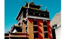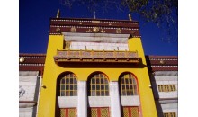 班禪新宮位于扎布倫寺以南,是十世班禪在1954年建造的夏宮,新宮建筑富麗堂皇,十分幽雅,是避暑的好地方。宮內(nèi)放置了很多西藏歷史文物及藝術(shù)精品,尤以一幅《八思巴會見忽必烈》的壁畫,最為精美。新宮有三道門,第一道門前檐有四根八角朱漆大柱抵頂,門殿浮雕著兇悍不馴的野獸、騰躍欲飛的蟠龍和各種花卉圖案門壁兩側(cè)。彩繪著卷云、猛虎、長龍、人物和佛教故事壁畫。筆法細(xì)膩,形神俱肖。